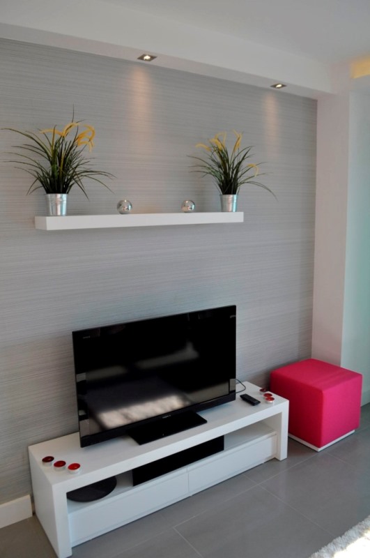 Door gebruik van een decoratief pleisterwerk op de hoofdmuur in de woonkamer en slaapkamers ontstaat er een balans met de wit afgewerkte muren en plafonds.